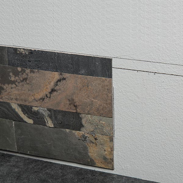Done correctly, the first row now aligns with the lower line and fits nicely along the countertop. Install the remaining tiles according to the Aspect Peel and Stick Stone Tile Backsplash Installation Guide.